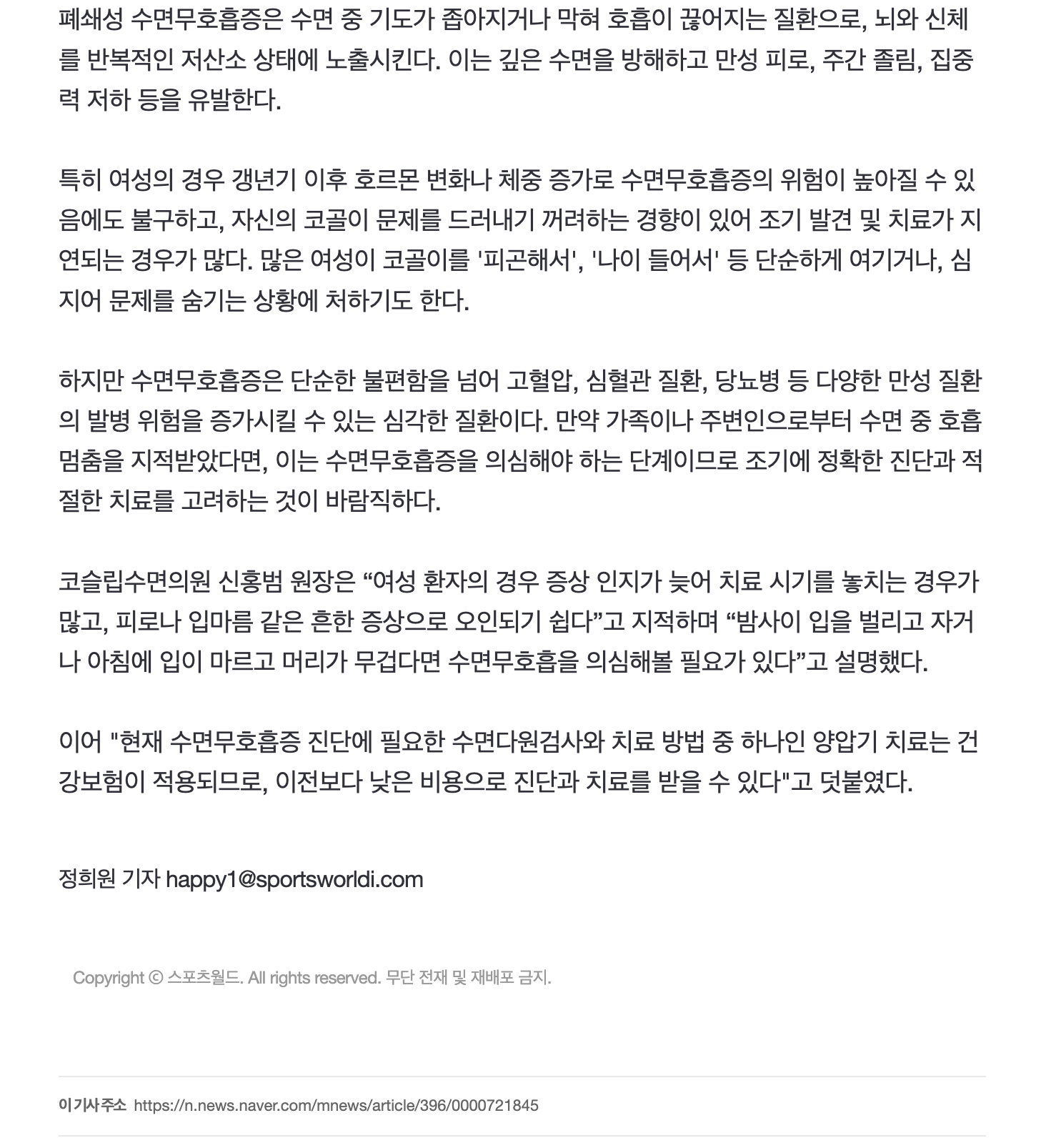 코슬립수면의원 신홍범 원장은 “여성 환자의 경우 증상 인지가 늦어 치료 시기를 놓치는 경우가 많고, 피로나 입마름 같은 흔한 증상으로 오인되기 쉽다”고 지적하며 “밤사이 입을 벌리고 자거나 아침에 입이 마르고 머리가 무겁다면 수면무호흡을 의심해볼 필요가 있다”고 설명했다.