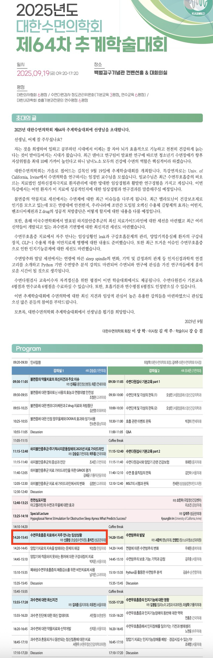 [대한수면의학회] 2025년 제64차 추계학술대회, 신홍범 원장님께서 좌장으로 초정되셨습니다.    일시: 2025-09-19 (금)장소: 백범김구기념관 컨벤션홀 ...