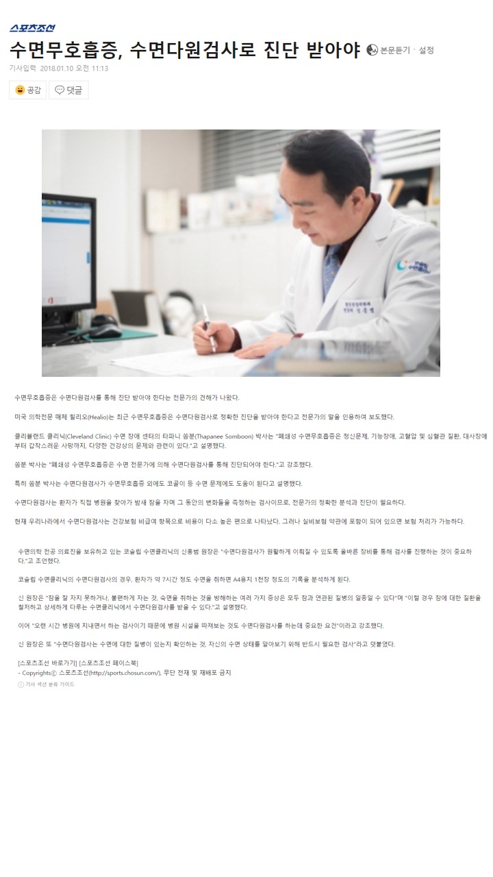 2018.01.10 [스포츠조선] 수면무호흡증, 수면다원검사로 진단 받아야 http://m.news.naver.com/read.nhn?mode=LSD&mid=sec&sid1=103&oid=076&aid=0003201204