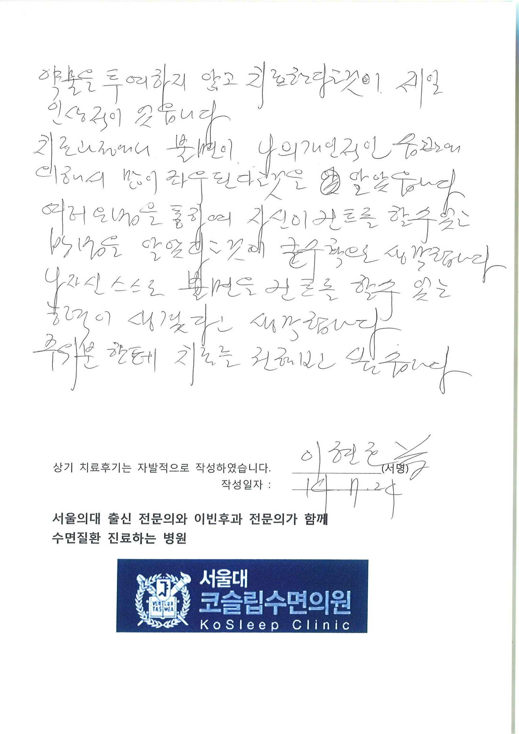 1년 반동안 약없이 잠을 잘수없었는데 코슬립의원에서 치료 3회 받은후 약없이 잘수있게 되어서 행복합니다. 앞으로 더 좋은 질높은 수면을 기대하면서 가르쳐주신 인지치료 행동 지침을 꾸준히 지키려고 노력해야 겠습니다.