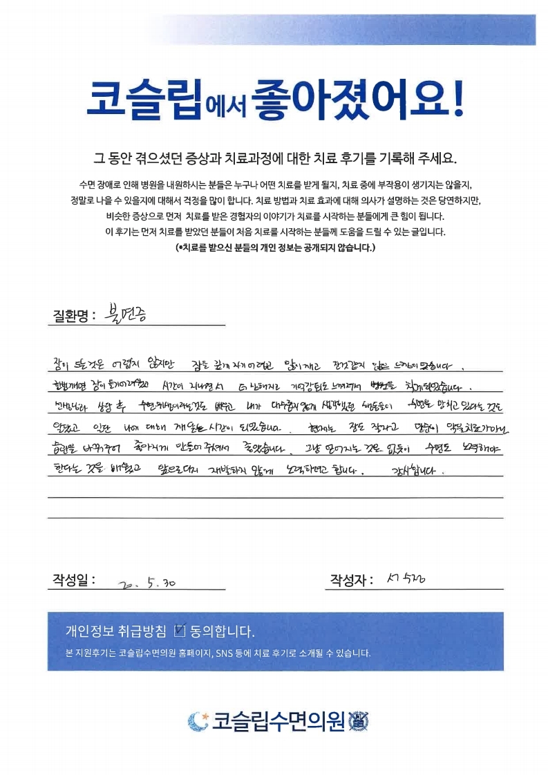 2019년 10월 친정아버님의 갑작스런 죽음으로 정신적 충격과 스트레스로 두달간 거의 잠 못 이루고 뜬눈으로 지새면서 불면증약을 복용하였으나 다행히 코슬립의원을 알게되어 (책으로 먼저 원장님을 알게되어 수소문) 2019.12.30 수면다...