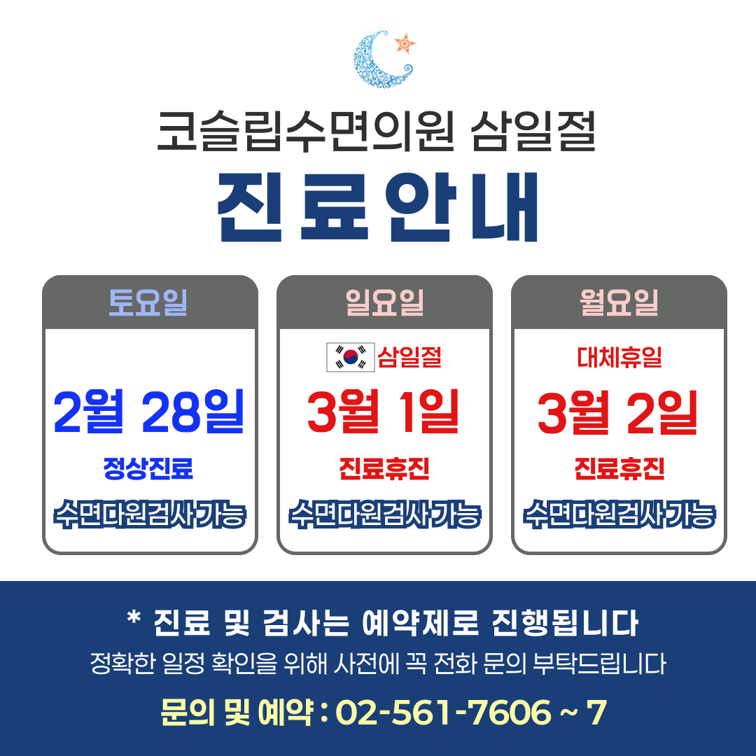 2월 28일 토요일정상 진료 ,수면다원검사 정상 시행합니다. 3월 1일 삼일절진료 휴진 ,수면다원검사 정상 시행합니다. (2026년 3월 1일 일요일)수면다원검사를 예약하신분은 안내받으신대로 내원하시면 됩니다.  3월 2일 ...