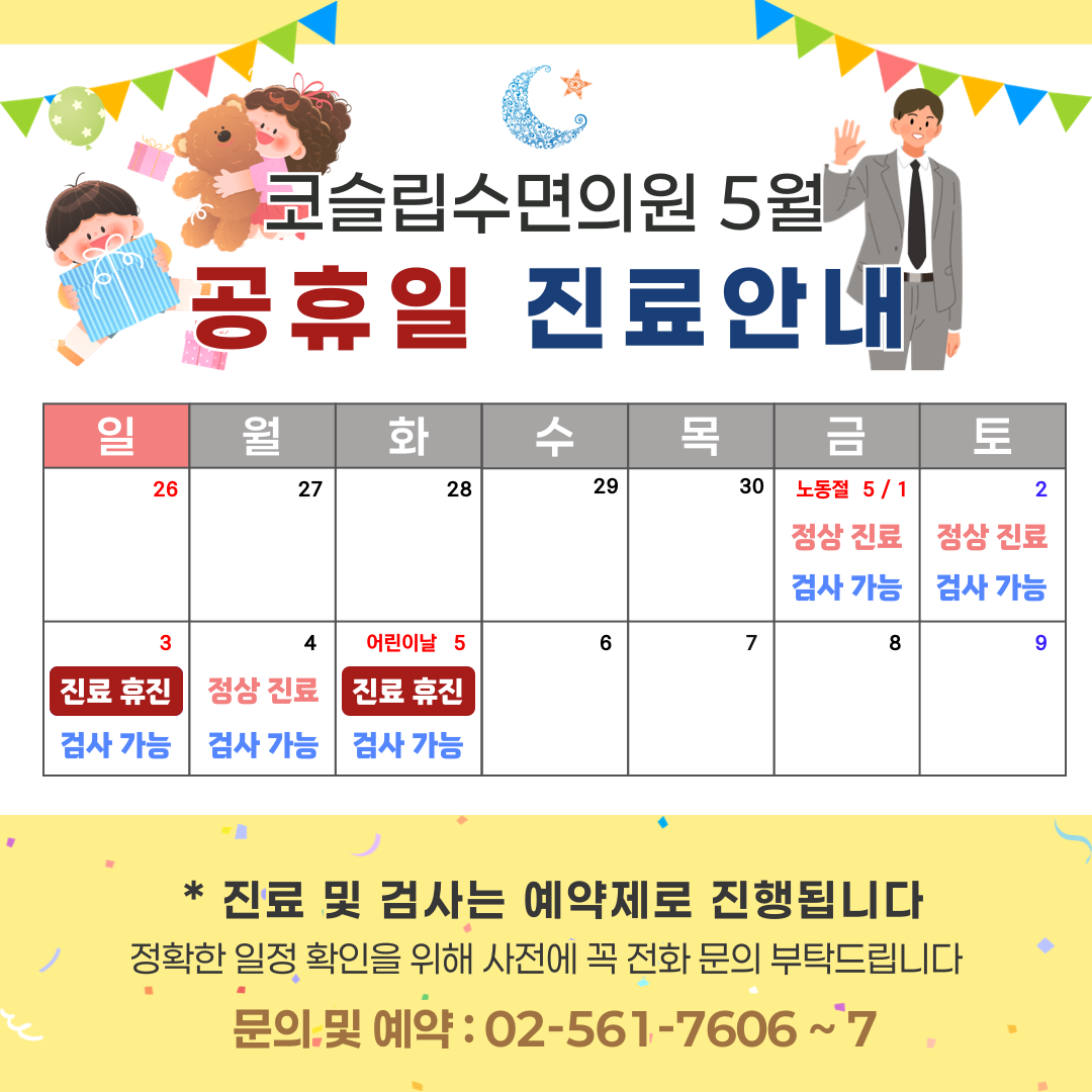 안녕하세요. 코슬립수면의원 입니다. 5월 진료 및 검사 안내 드립니다. 5월 1일 금요일 근로자의 날 : 정상 진료 , 검사 가능5월 2일 토요일  : 정상 진료&...